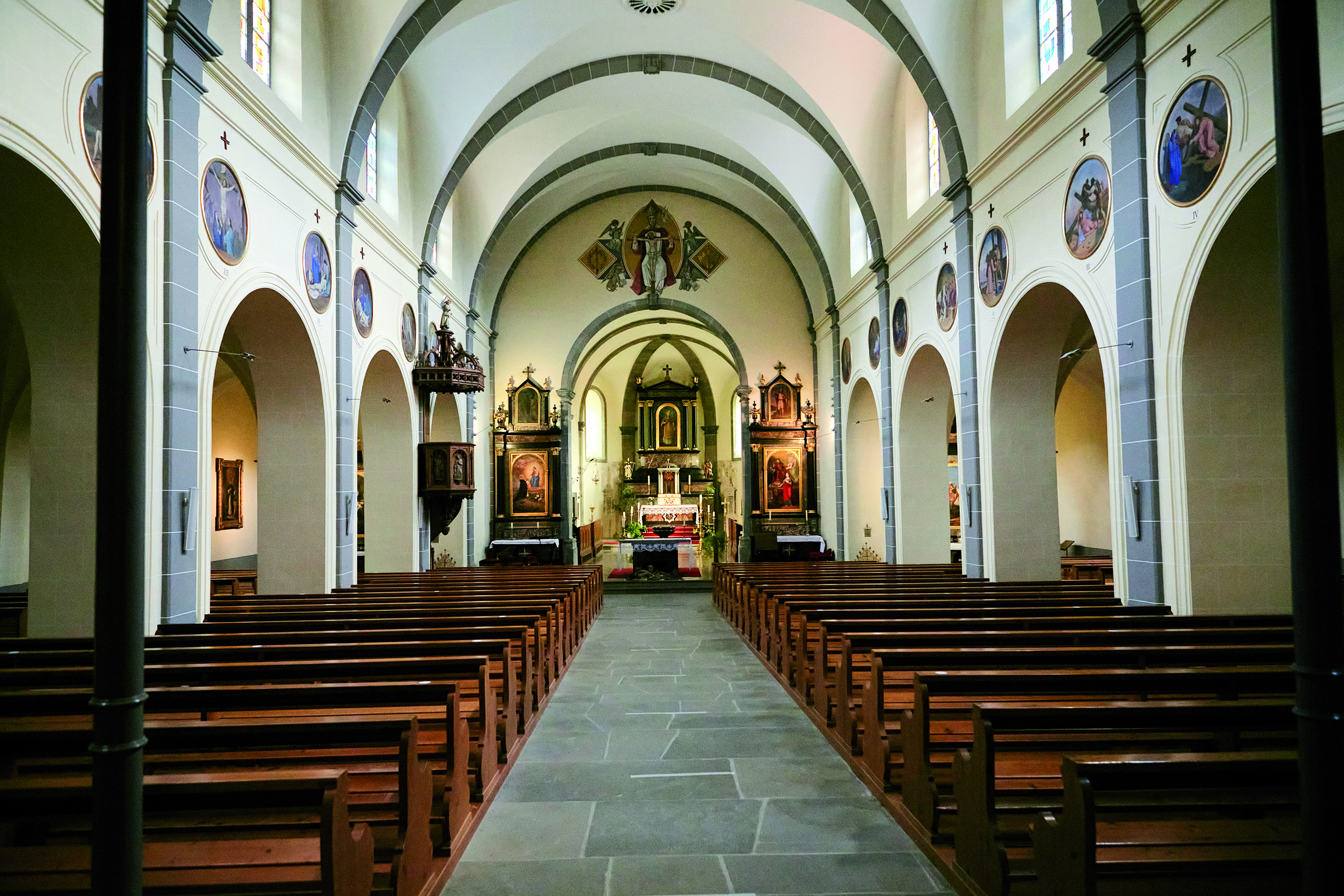 Elle possède une tour-porche de 1682, un chœur de 1730-1731 et une nef reconstruite après l’incendie de 1856 (Jakob Ulrich Lendi, architecte). A l’entrée de la nef, à voir une grille Régence de 1758. La polychromie date de 1921. Elle date de la rénovation due à l’architecte Fernand Dumas. Le maître-autel et autels latéraux en marbre ont été réalisés par l’atelier veveysan de Louis Doret en 1846.